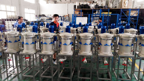 二、在平時(shí)的工作狀態(tài)下,電鍍過(guò)濾機(jī)應(yīng)放在靠近藥液槽的地方,水泵進(jìn)水管不宜過(guò)長(zhǎng),一般3米比較適宜,出液管的長(zhǎng)度則應(yīng)根據(jù)場(chǎng)地環(huán)境和實(shí)際的需要而定。進(jìn)出水管都應(yīng)放入槽內(nèi)并固定到位,在進(jìn)水管端必需加裝粗濾器,預(yù)防小的零件吸入泵腔內(nèi),損壞機(jī)件。向引水筒內(nèi)注入藥液,打開(kāi)引水筒底下的引水球閥,使藥液順著引水管流入泵腔內(nèi),直至注滿進(jìn)水管,關(guān)閉引水球閥,進(jìn)行點(diǎn)動(dòng)看設(shè)備中的電機(jī)是否正轉(zhuǎn),之后再點(diǎn)動(dòng),直至水泵流速正常。打開(kāi)過(guò)濾筒蓋上的放氣閥,將過(guò)濾筒內(nèi)的空氣放出,直至放氣閥有藥液噴出即可。此時(shí)我們?cè)賹⒎艢忾y關(guān)閉,機(jī)器正常運(yùn)轉(zhuǎn)。經(jīng)過(guò)一段時(shí)間的連續(xù)循環(huán)過(guò)濾,在濾芯上攔截的濾渣漸漸增厚,過(guò)濾筒內(nèi)的壓力越來(lái)越大,流量越來(lái)越小,此時(shí)應(yīng)注意及時(shí)清洗濾芯。