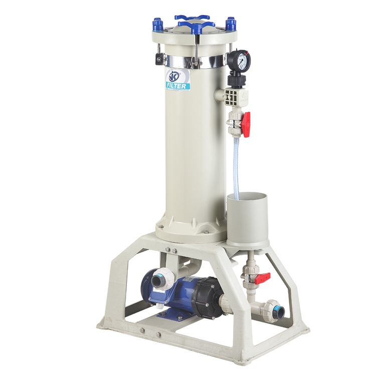 立式皮膜專用過濾機(jī)是由濾桶、濾芯、腳架和耐酸堿自吸泵組成,濾桶由扣環(huán)、單眼螺絲、把手、壓力表等組成。腳架由注水桶與架子組成;耐酸堿自吸泵由馬達(dá)與泵頭組成。藥液從耐酸堿自吸泵進(jìn)入到過濾桶內(nèi),固體顆粒因其粒徑大于過濾介質(zhì)(濾布)的孔徑被截留在濾芯里,濾液則從濾桶的出孔流出。