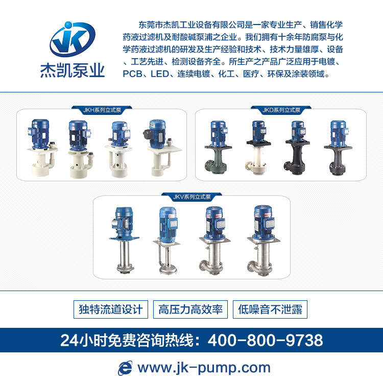 東莞市杰凱工業(yè)設(shè)備有限公司2006年6月正式成立.是一家專業(yè)生產(chǎn),銷售耐酸堿立式泵,化學藥液過濾機及耐酸堿泵浦之企業(yè).我們擁有十余年防腐泵與化學藥液過濾機的研發(fā)及生產(chǎn)經(jīng)驗和技術(shù),技術(shù)力量雄厚,設(shè)備,工藝先進,檢測設(shè)備齊全.所生產(chǎn)之產(chǎn)品廣泛應(yīng)用于電鍍,PCB,LED,連續(xù)電鍍,化工,醫(yī)療,環(huán)保及涂裝領(lǐng)域,歡迎新老客戶前來選購.