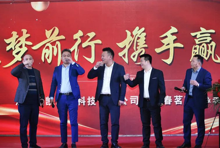 禹總、易總、白總、劉總、田總五位領(lǐng)導(dǎo)共同為春茗晚宴祝酒道賀,期盼杰凱集團(tuán)在新的一年里能繼奏凱歌、續(xù)寫華章!