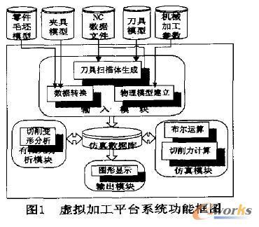 虛擬切削加工是指在數(shù)控機(jī)床上進(jìn)行的切削加工過程在虛擬環(huán)境下的映射。采用虛擬加工環(huán)境可以為一些零件的加工提供一個(gè)試切環(huán)境。圖1所示為虛擬加工平臺(tái)系統(tǒng)功能框圖。該系統(tǒng)的硬件環(huán)境是 PIII550。并利用現(xiàn)有的 CAD/CAM軟件所具有的強(qiáng)大的幾何建模及NC程序生成的功能,建立虛擬加工所需的幾何模犁以及豐成相應(yīng)的NC程序。所建立的幾何模型包括毛坯、零件、刀具和夾具等的幾何模型。所依據(jù)的建模平臺(tái)和分析平臺(tái)為 SolidWorks,CAMWorks,Cosmos/Works。該系統(tǒng)主要由四大核心模塊組成:輸入模塊,仿真模塊,分析模塊和輸出模塊。