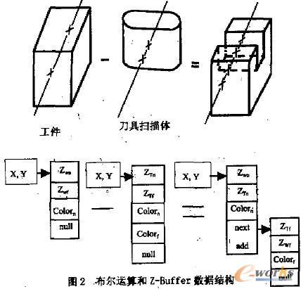 其運(yùn)算過程如圖2所示。在數(shù)據(jù)結(jié)構(gòu)中,對(duì)應(yīng)每一點(diǎn)(x,y)有一個(gè)近端Z值Zx,遠(yuǎn)端Z值Zy顏色值和指向該射線上下一個(gè)單元的指針。如圖所示,和工件的數(shù)據(jù)結(jié)構(gòu)的不同之處在于刀具的數(shù)據(jù)結(jié)構(gòu)中增加了遠(yuǎn)端的顏色值,這樣可以方便布爾運(yùn)算。圖中所示工拌開始時(shí)是毛坯,因此,沿射線方向只有一段,故指針為 null。同理,刀具的指針也為 null。當(dāng)?shù)毒咔邢鞴ぜr(shí),如圖所示,兩個(gè)實(shí)體的布爾運(yùn)算在采用Z-Buffer的數(shù)據(jù)結(jié)構(gòu)后就簡化為視線方向的一維求差運(yùn)算。對(duì)應(yīng)像素(x,y)的射線。這時(shí)沿視線有四個(gè)交點(diǎn),由于工件被刀具掃描體分成兩部分,視線被裁剪為兩段。因此,對(duì)應(yīng)該像素點(diǎn) 少就有兩個(gè)單元。所進(jìn)行的布爾運(yùn)算只需對(duì)原來工件的數(shù)據(jù)結(jié)構(gòu)進(jìn)行 改,工件 單元遠(yuǎn)端Z值被刀具的近端Z值替換、指針不再等于零而是指向新產(chǎn)生的單元,而新單元的近端Z值為刀具的遠(yuǎn)端Z值。遠(yuǎn)端Z值是原工件單元的遠(yuǎn)端Z值。顏色等于刀具的遠(yuǎn)端顏色值,指針為零。系統(tǒng)對(duì)所有的像素不斷重復(fù)進(jìn)行著這樣的一維運(yùn)算。該種算法的分辨率取決于緩沖器的容量。