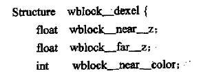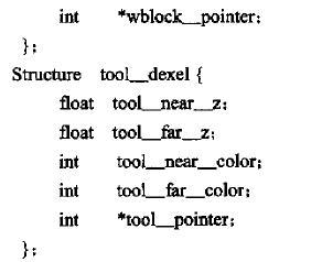 數(shù)據(jù)模型可以用光線投射法求得。因?yàn)楫?dāng)物體以邊界表示描述時(shí),光線投射方法通常用來實(shí)現(xiàn)構(gòu)造實(shí)體幾何操作,令投影平面與顯示平面一致,從每一個(gè)像素位置發(fā)射一根射線穿過物體,然后沿每根射線路徑定出表面相交部分,保存深度值。工件和刀具的數(shù)據(jù)結(jié)構(gòu)為: