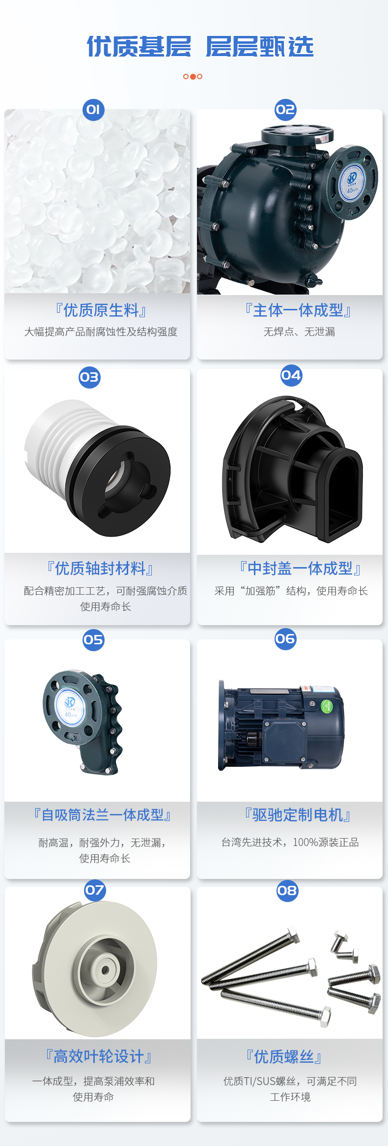 1、泵體采用優(yōu)質(zhì)原生料,大幅提高產(chǎn)品耐腐蝕性及結(jié)構(gòu)強(qiáng)度; 2、自吸筒與法蘭一體成型,無焊點(diǎn),無泄漏; 3、中封蓋一體成型,采用強(qiáng)筋穩(wěn)固,使用壽命長; 4、高效葉輪設(shè)計,一體成型,提高泵浦效率和使用壽命; 5、軸封材質(zhì)可配合使用環(huán)境選擇不同材質(zhì)。