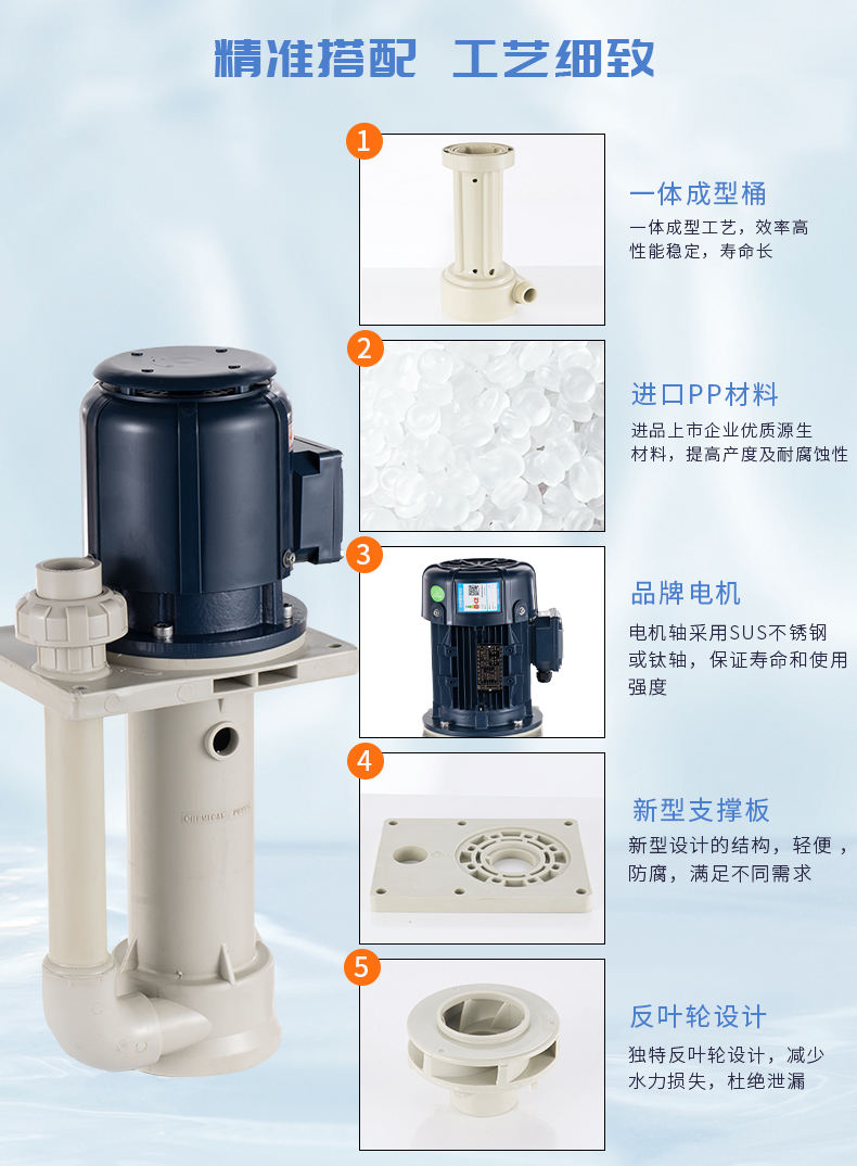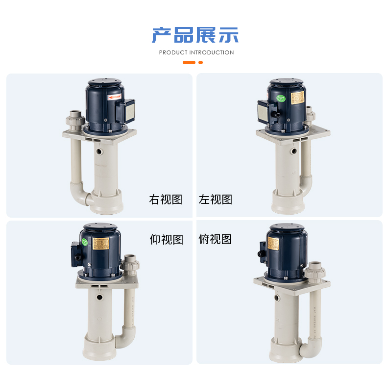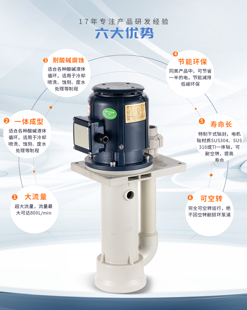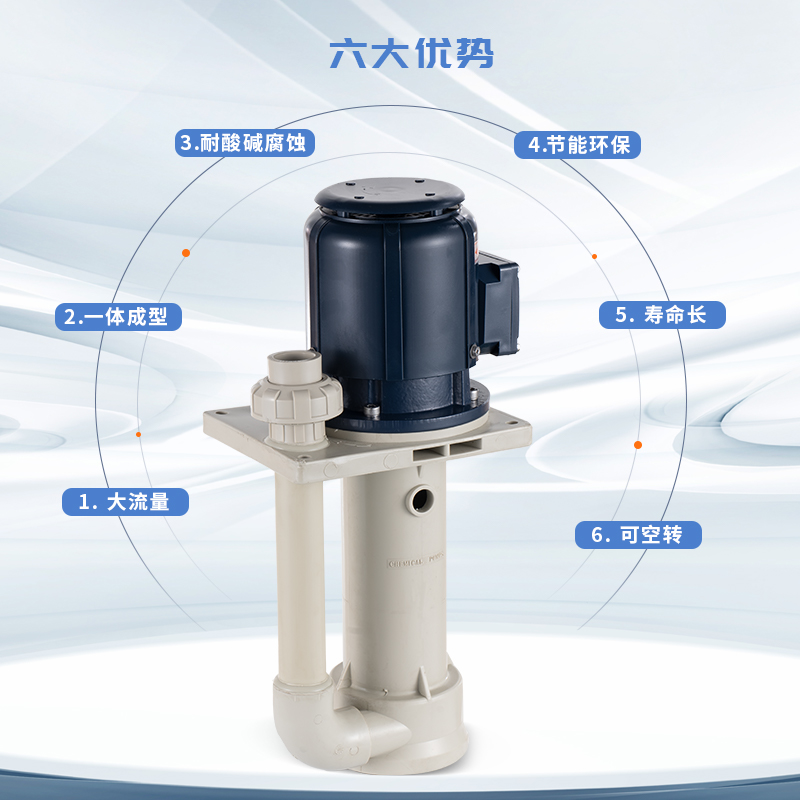 1、泵體采用PP/PVDF工程塑料射出成型,耐腐蝕,可空轉(zhuǎn)運(yùn)行; 2、適用于各種酸堿液體輸送,低壓噴淋,連續(xù)電鍍等環(huán)境; 3、電機(jī)軸采用SUS不銹鋼軸,電機(jī)軸采用高速對(duì)碰焊接軸工藝,保證長(zhǎng)軸使用強(qiáng)度; 4、泵頭組件完全模具化,標(biāo)準(zhǔn)化,拆裝方便,便于維護(hù)保養(yǎng)。
