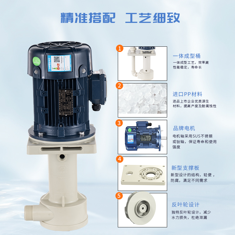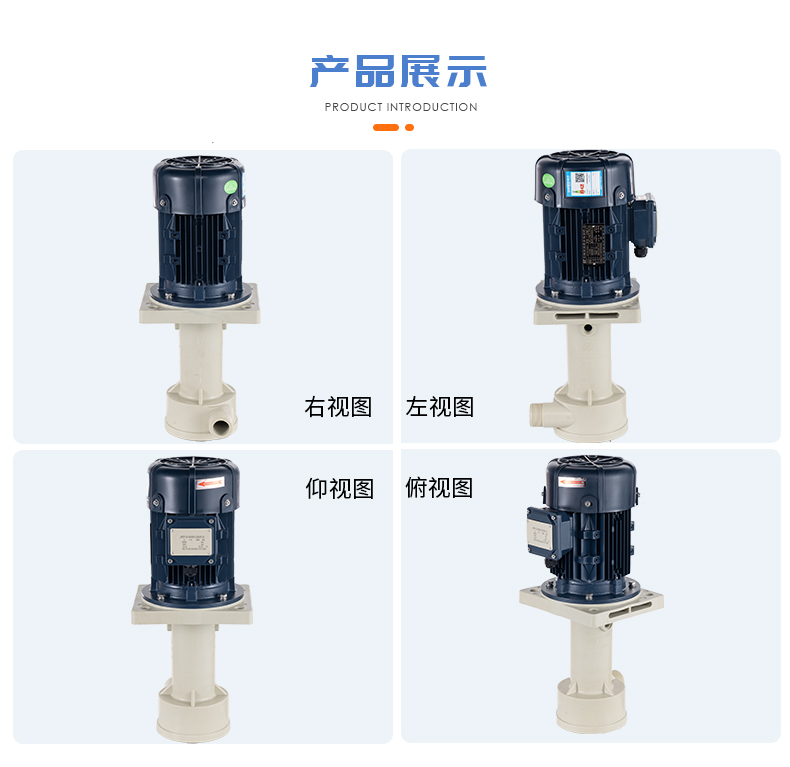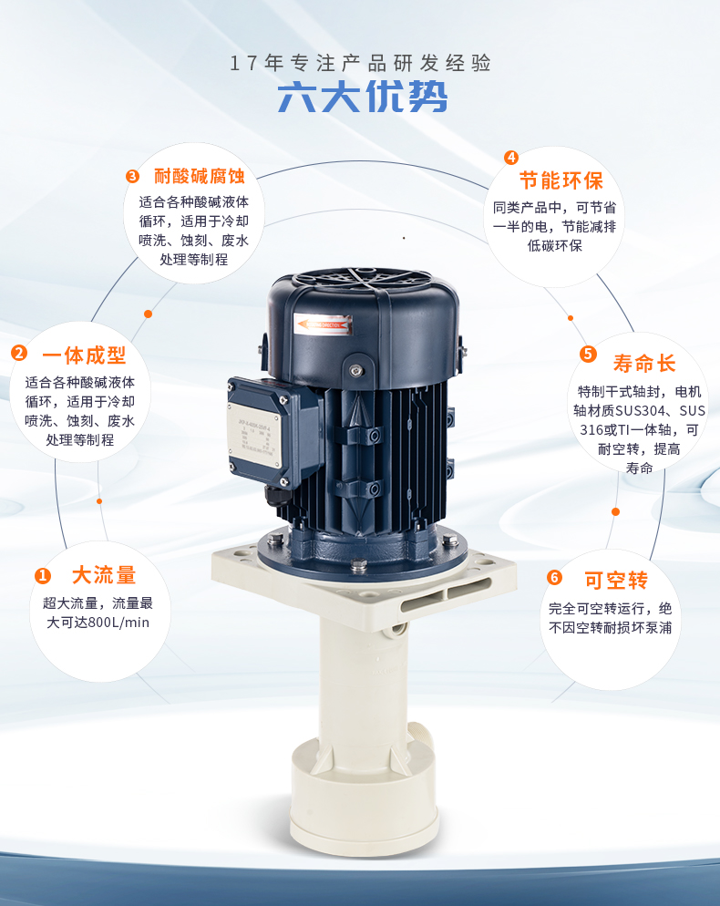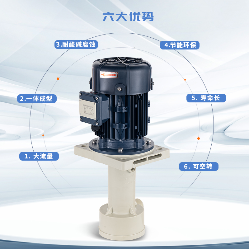 1、泵體采用PP/PVDF工程塑料射出成型,耐腐蝕,可空轉(zhuǎn)運(yùn)行; 2、適用于各種酸堿液體輸送,低壓噴淋,連續(xù)電鍍等環(huán)境; 3、電機(jī)軸采用SUS不銹鋼軸,電機(jī)軸采用高速對(duì)碰焊接軸工藝,保證長(zhǎng)軸使用強(qiáng)度; 4、泵頭組件完全模具化,標(biāo)準(zhǔn)化,拆裝方便,便于維護(hù)保養(yǎng)。