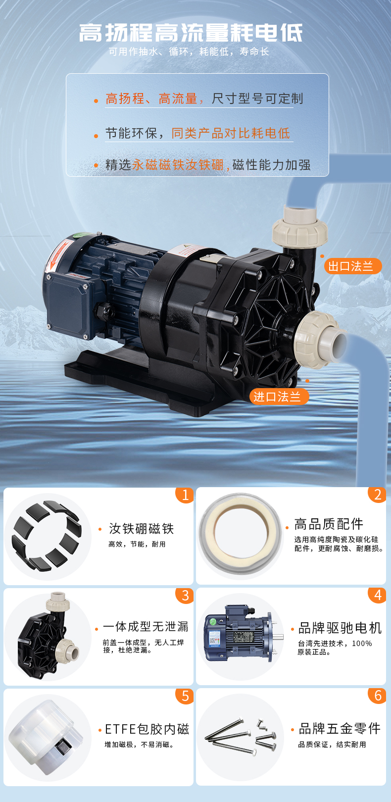 1、泵浦采用優(yōu)質(zhì)CFRPP/PVDF/ETFE原生材料; 2、高純度陶瓷及碳化硅軸承、軸芯; 3、耐腐蝕、耐磨損、耐熱沖擊; 4、超大流量,流量可達(dá)1100L/MIN; 適用于:蝕刻液、電鍍液、電泳液、污水提升、輸送、噴淋等。