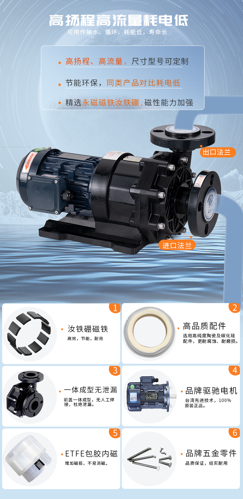 1、泵浦采用優(yōu)質(zhì)CFRPP/PVDF/ETFE原生材料; 2、高純度陶瓷及碳化硅軸承、軸芯; 3、耐腐蝕、耐磨損、耐熱沖擊; 4、超大流量,流量可達(dá)1100L/MIN; 適用于:蝕刻液、電鍍液、電泳液、污水提升、輸送、噴淋等。