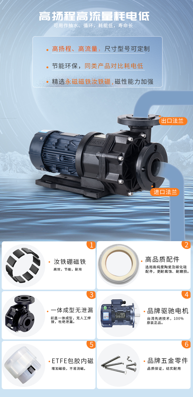 1、泵浦采用優(yōu)質(zhì)CFRPP/PVDF/ETFE原生材料; 2、高純度陶瓷及碳化硅軸承、軸芯; 3、耐腐蝕、耐磨損、耐熱沖擊; 4、超大流量,流量可達(dá)1100L/MIN; 適用于:蝕刻液、電鍍液、電泳液、污水提升、輸送、噴淋等。