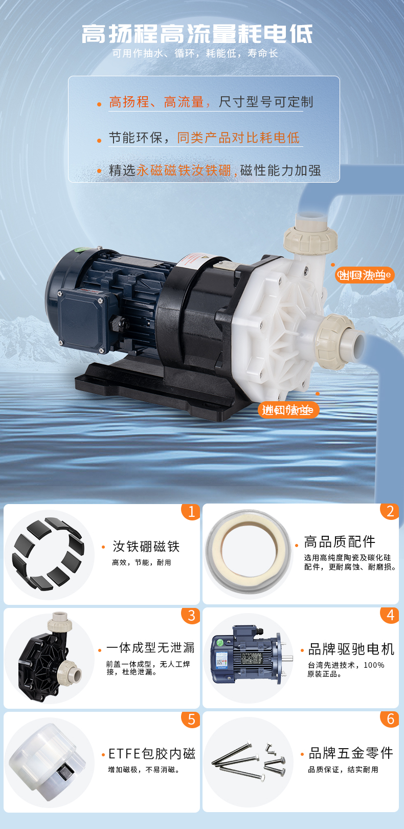 1、泵浦采用優(yōu)質(zhì)CFRPP/PVDF/ETFE原生材料; 2、高純度陶瓷及碳化硅軸承、軸芯; 3、耐腐蝕、耐磨損、耐熱沖擊; 4、超大流量,流量可達(dá)1100L/MIN; 適用于:蝕刻液、電鍍液、電泳液、污水提升、輸送、噴淋等。