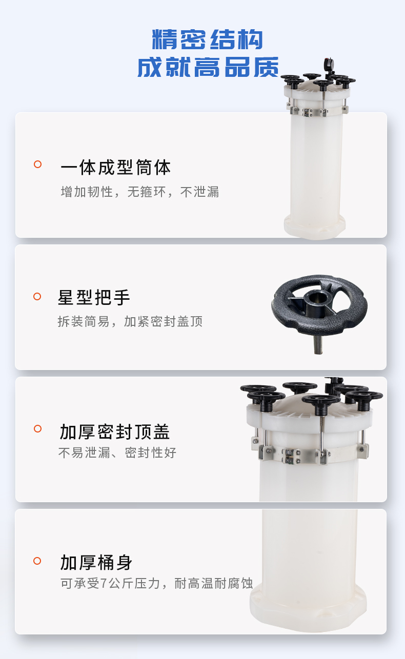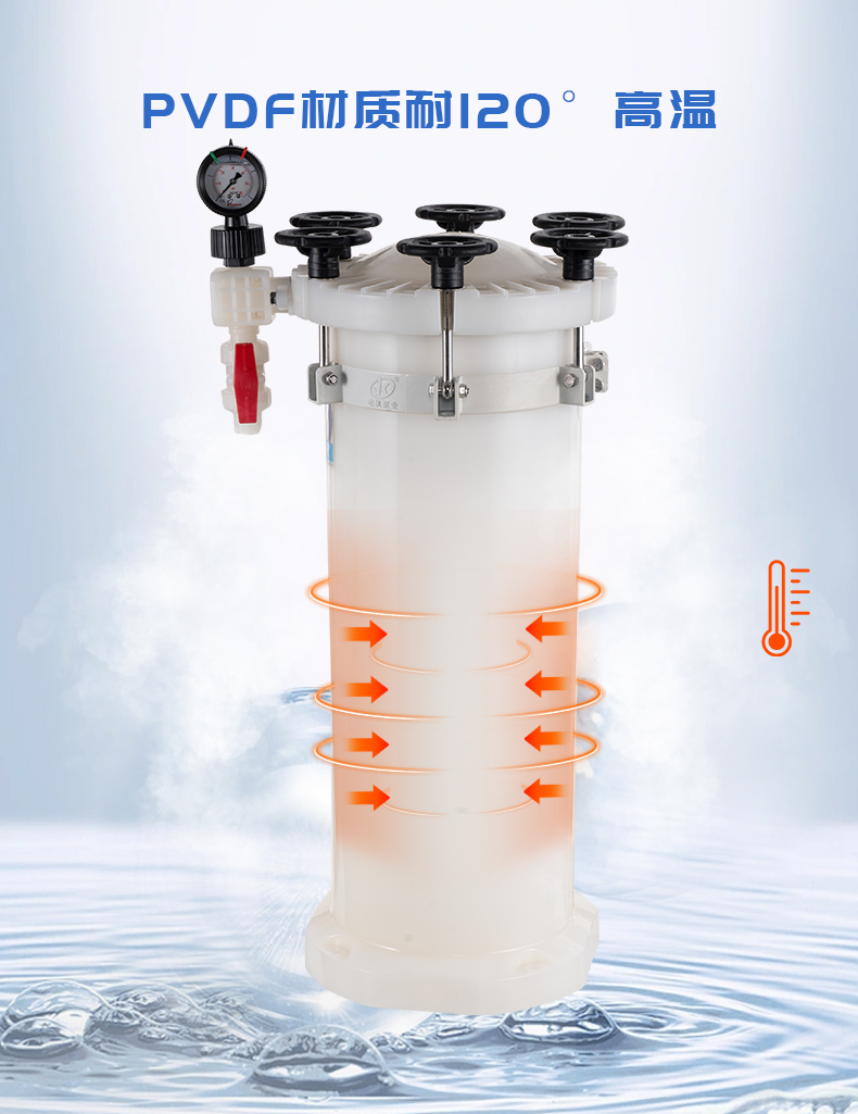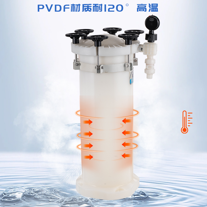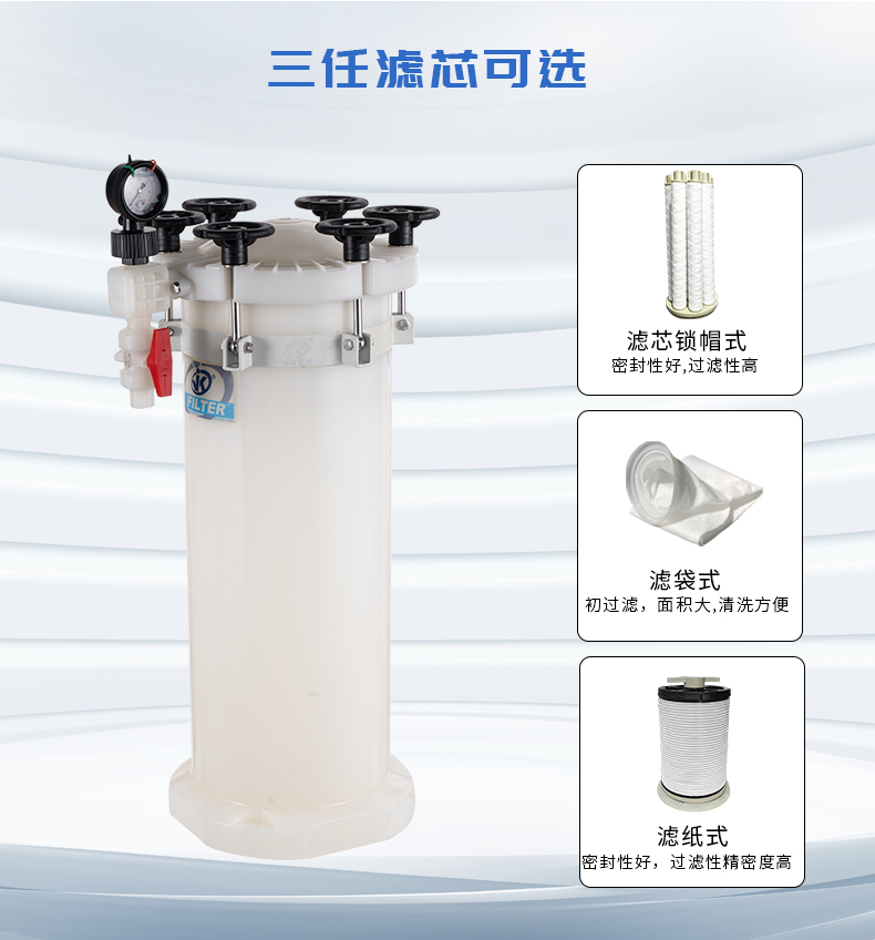 1、PPH/PVDF 原生材料,多種濾材可選; 2、桶身排氣,無金屬扣環(huán)+翻蓋設(shè)計(jì); 3、加厚桶一體成型設(shè)計(jì),整機(jī)無焊接點(diǎn),100%無泄漏,結(jié)實(shí)、安全。使用壽命可達(dá)8-10 年; 4、配套多種款式濾材,滿足市場(chǎng)多種需求; 5、廣泛用于酸堿藥水,電鍍藥水,蝕刻液,清洗液過濾。