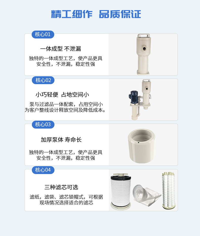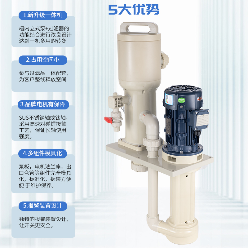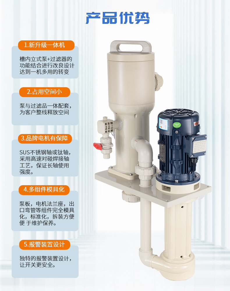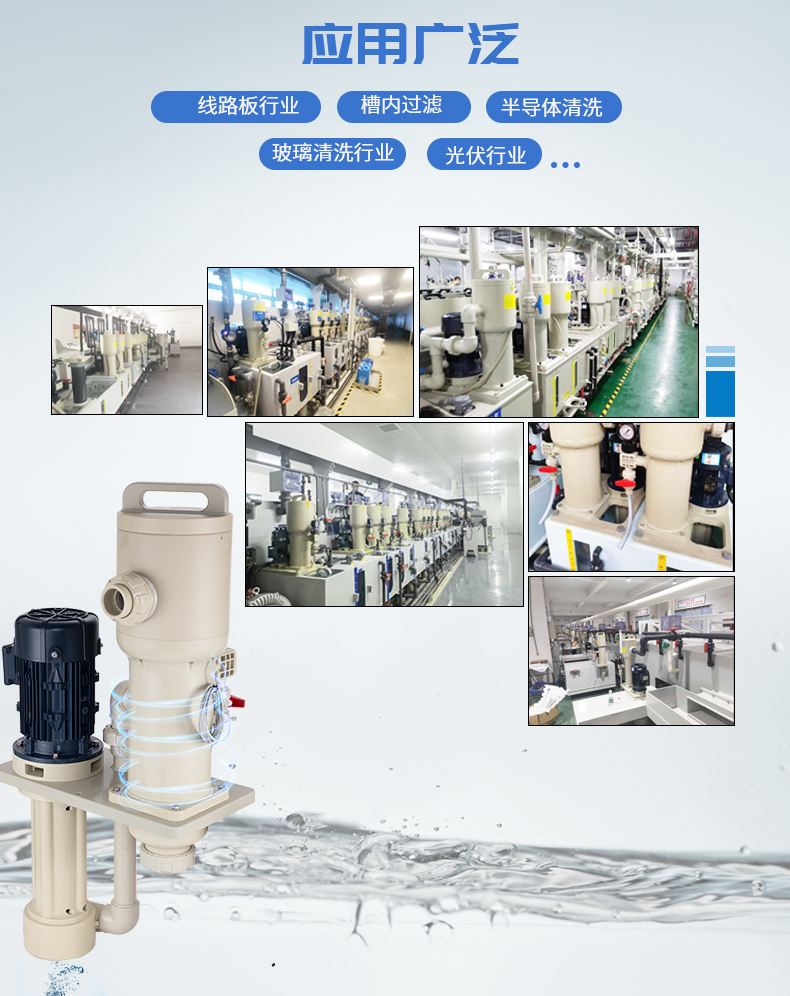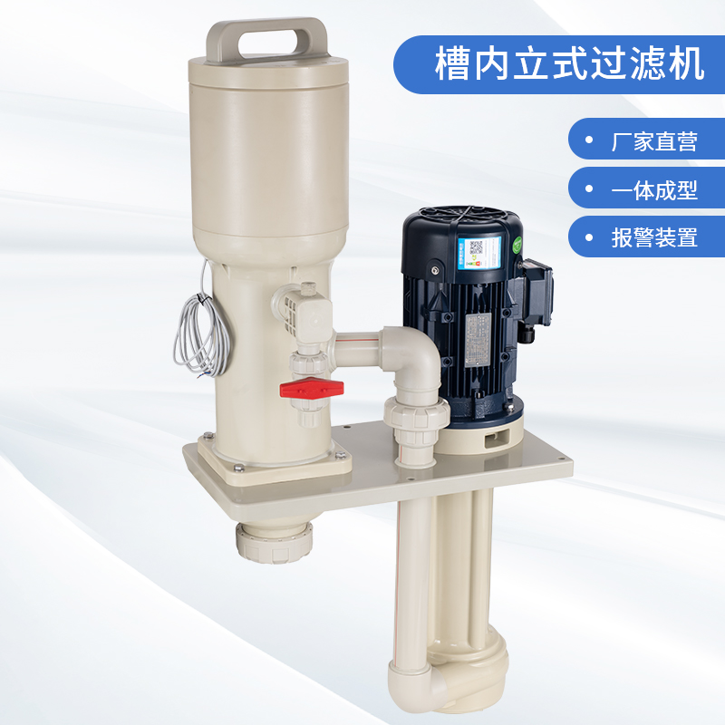 1、采用優(yōu)質(zhì)PPH/PVDF優(yōu)質(zhì)原材料,提升耐腐蝕能性及結(jié)構(gòu)強(qiáng)度; 2、泵與過(guò)濾器一體配套,緊湊,占用空間小,為客戶整線設(shè)計(jì)釋放空間及降低成本; 3、槽內(nèi)安裝,可配套濾芯,濾袋,網(wǎng)板多種方式,適用于噴淋、循環(huán)等制程; 4、更換濾芯快捷、省時(shí),省力; 5、獨(dú)特的報(bào)警裝置設(shè)計(jì),開蓋更安全。