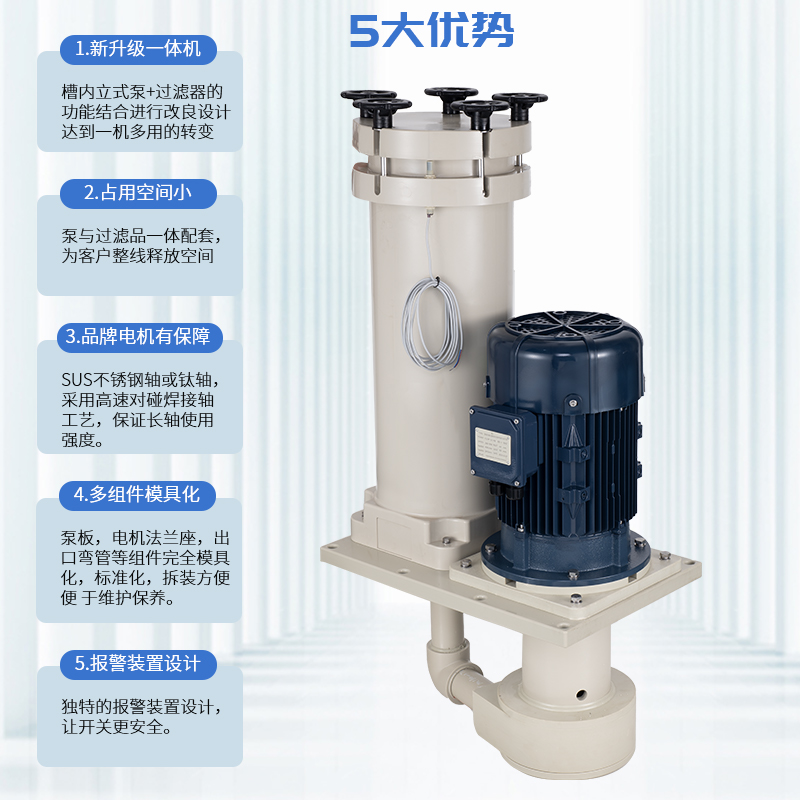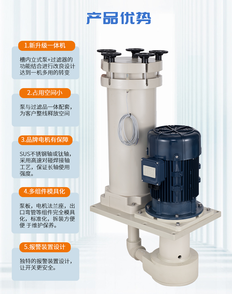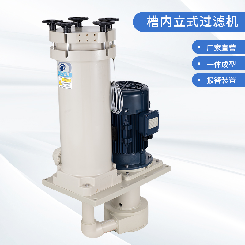 1、采用優(yōu)質(zhì)PPH/PVDF優(yōu)質(zhì)原材料,提升耐腐蝕能性及結(jié)構(gòu)強(qiáng)度; 2、泵與過(guò)濾器一體配套,緊湊,占用空間小,為客戶整線設(shè)計(jì)釋放空間及降低成本; 3、槽內(nèi)安裝,可配套濾芯,濾袋,網(wǎng)板多種方式,適用于噴淋、循環(huán)等制程; 4、更換濾芯快捷、省時(shí),省力; 5、獨(dú)特的報(bào)警裝置設(shè)計(jì),開(kāi)蓋更安全。