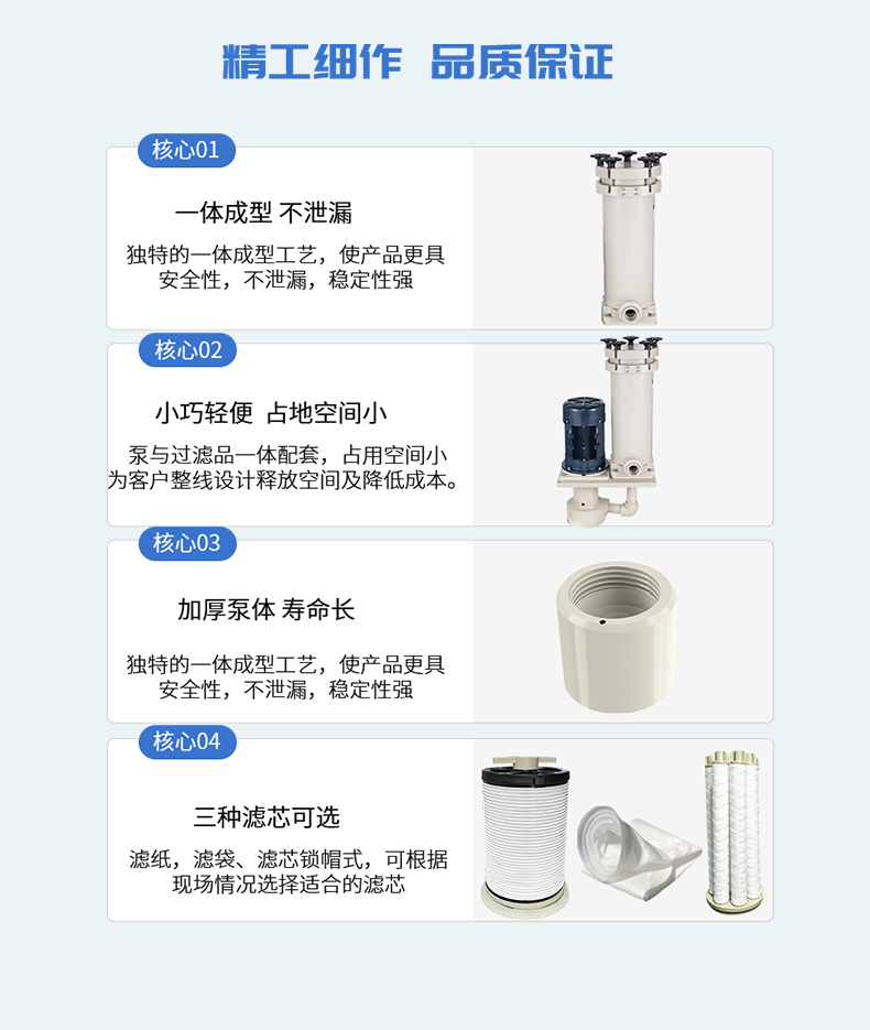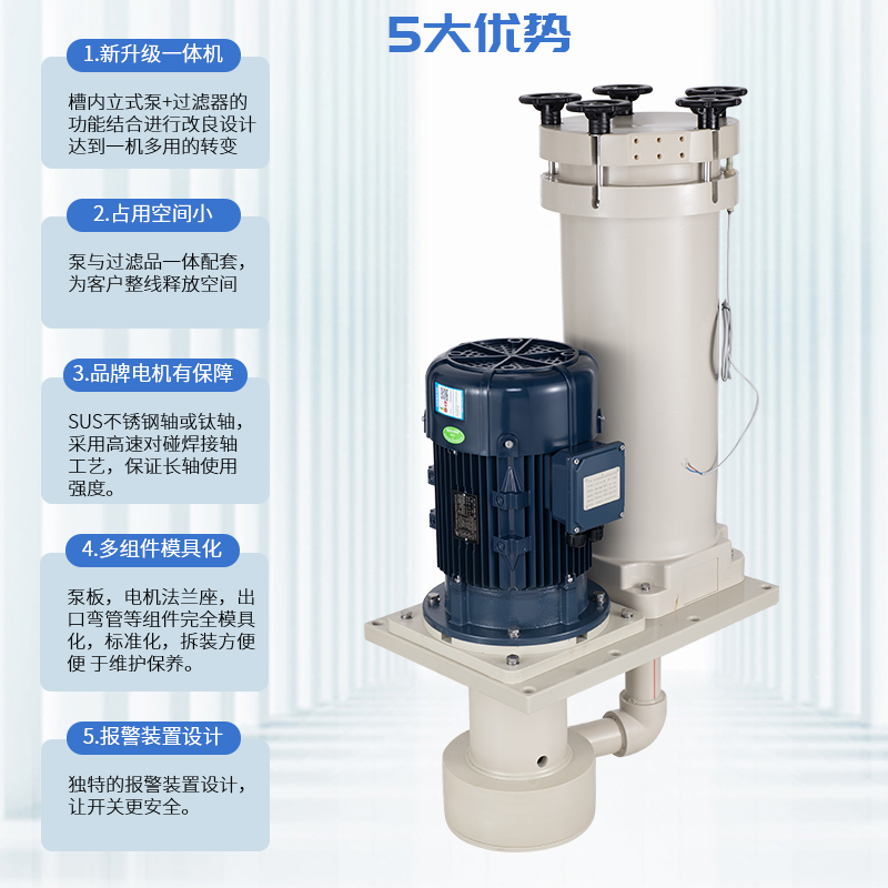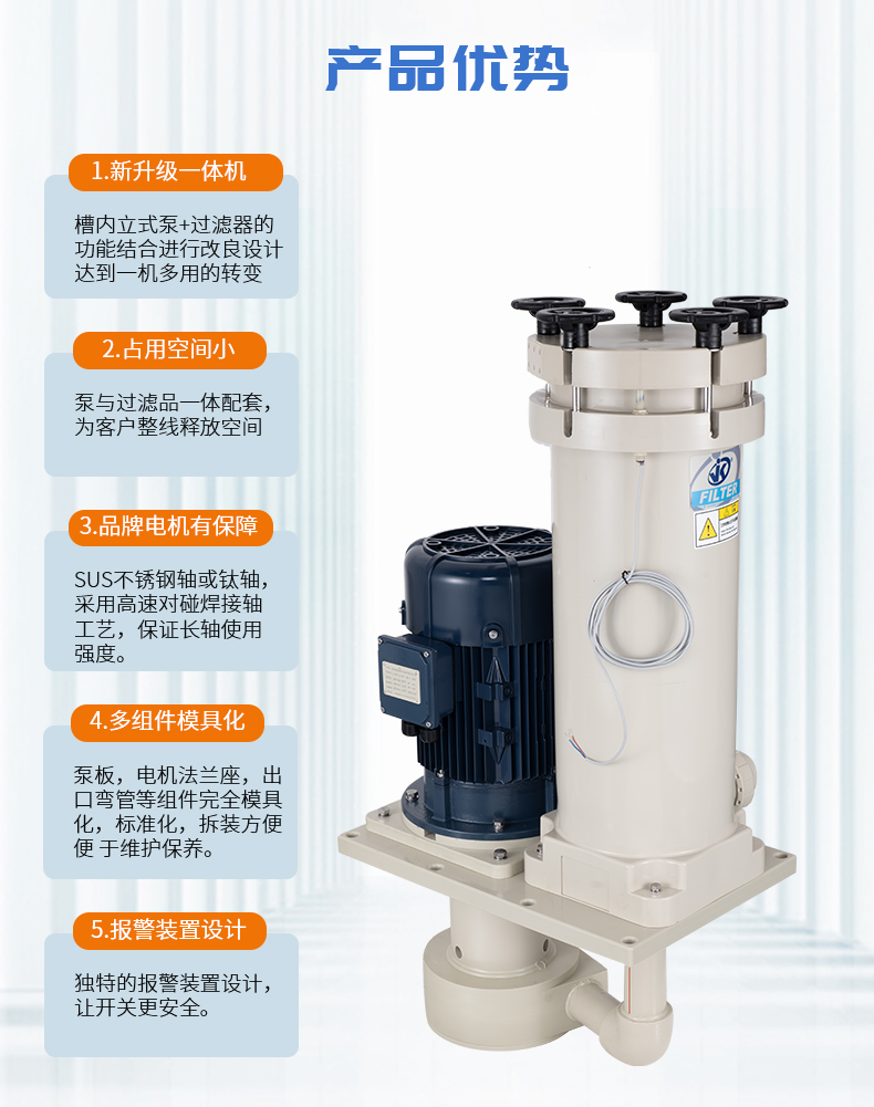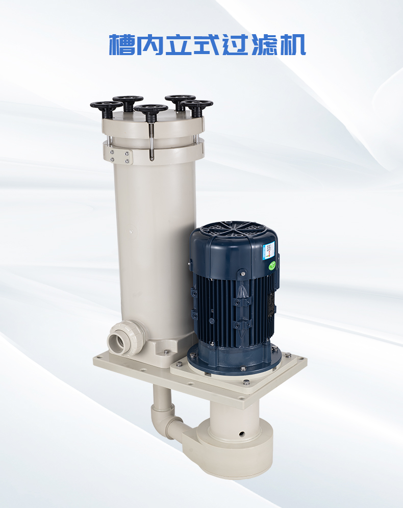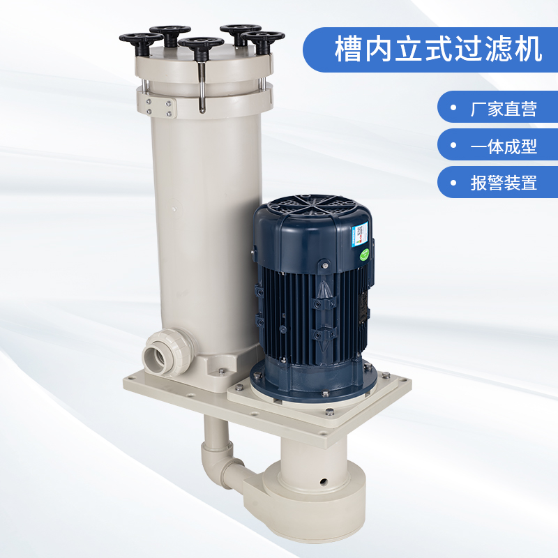 1、采用優(yōu)質(zhì)PPH/PVDF優(yōu)質(zhì)原材料,提升耐腐蝕能性及結(jié)構(gòu)強(qiáng)度; 2、泵與過(guò)濾器一體配套,緊湊,占用空間小,為客戶整線設(shè)計(jì)釋放空間及降低成本; 3、槽內(nèi)安裝,可配套濾芯,濾袋,網(wǎng)板多種方式,適用于噴淋、循環(huán)等制程; 4、更換濾芯快捷、省時(shí),省力; 5、獨(dú)特的報(bào)警裝置設(shè)計(jì),開蓋更安全。